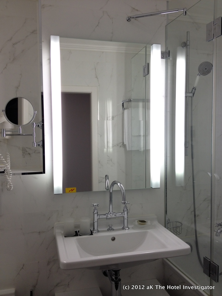 Montreux | Suisse Majestic Published April 15, 2013 at 768 × 1024 in On the Swiss Riviera, a historic property attempts to balance past and present Guest bathroom The marble-clad bathrooms are small and functional.