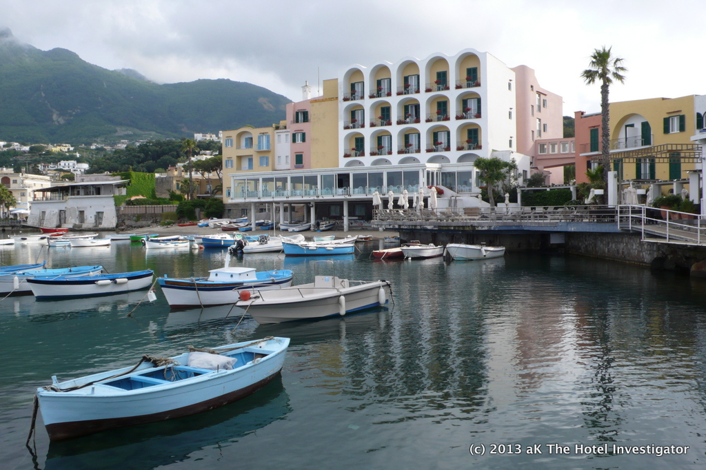 The main part of the hotel seen from the hotel’s private pier: the ‘Regina Isabella’ building with its glassed-in restaurant (middle), a small portion of the ‘Belvedere’ wing (right) connected by the covered bridge on the second floor that also leads to the spa.