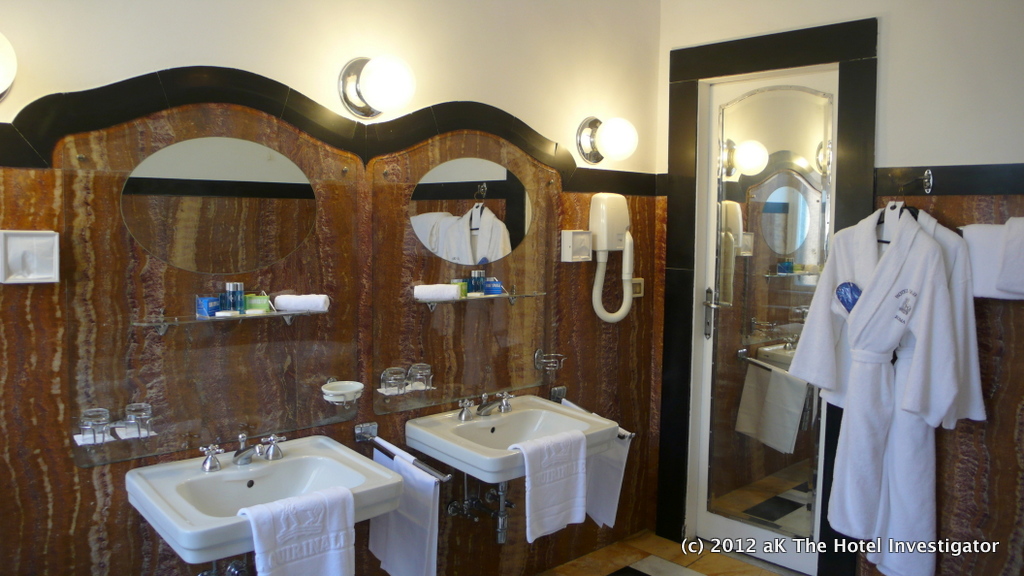 While most bathrooms of the ‘Quirinale’ have been unfortunately modernized with plain white tiles, a small number still feature their original furnishings that date back to the 1920s. Part of the hotel’s most prestigious suite, this exceptionally luxurious bathroom is a marvel and unique within the hotel.