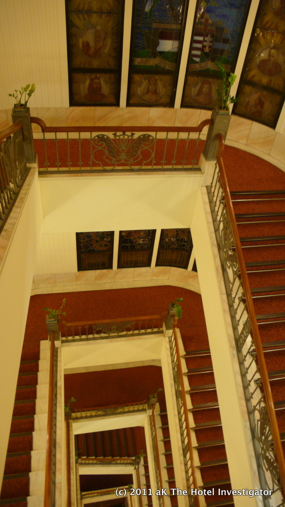 Budapest | Gellért Published September 26, 2014 at 576 × 1024 in On the banks of the Danube, a confusion of styles and genres Main staircase Stained glass windows on each landing contrast with the sobriety of the hotel’s main staircase. The railings, however, are a recent re-interpretation of the original, prewar design.